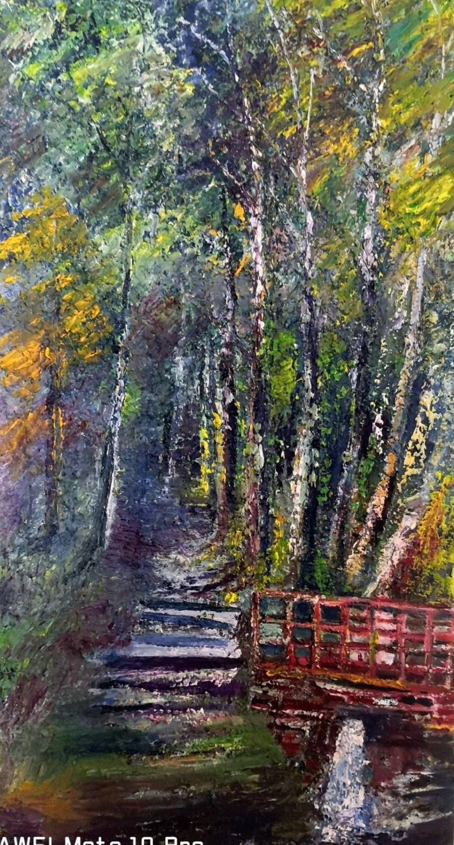 This is a picture of a heavily wooded area and pathway the trees and leaves are painted to show the light shining through the trees. The pathway climbs up past a bridge and water cascading painted from my imagination it reminds me of my childhood a mystical place.