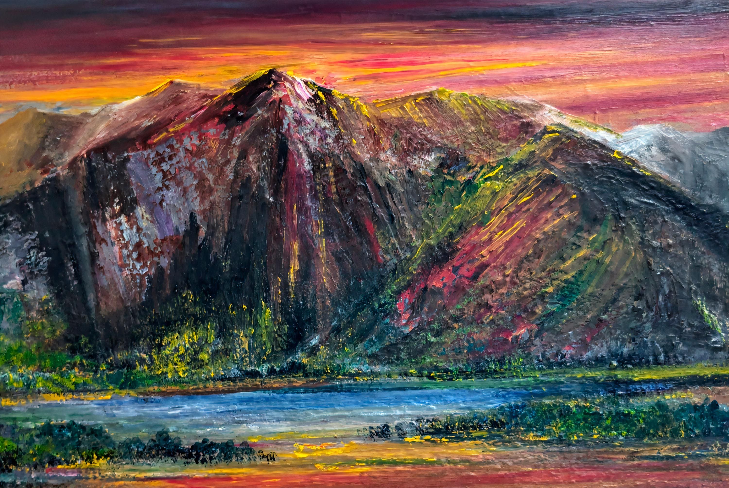 Ring of fire mountain scene with vivid red sunset
