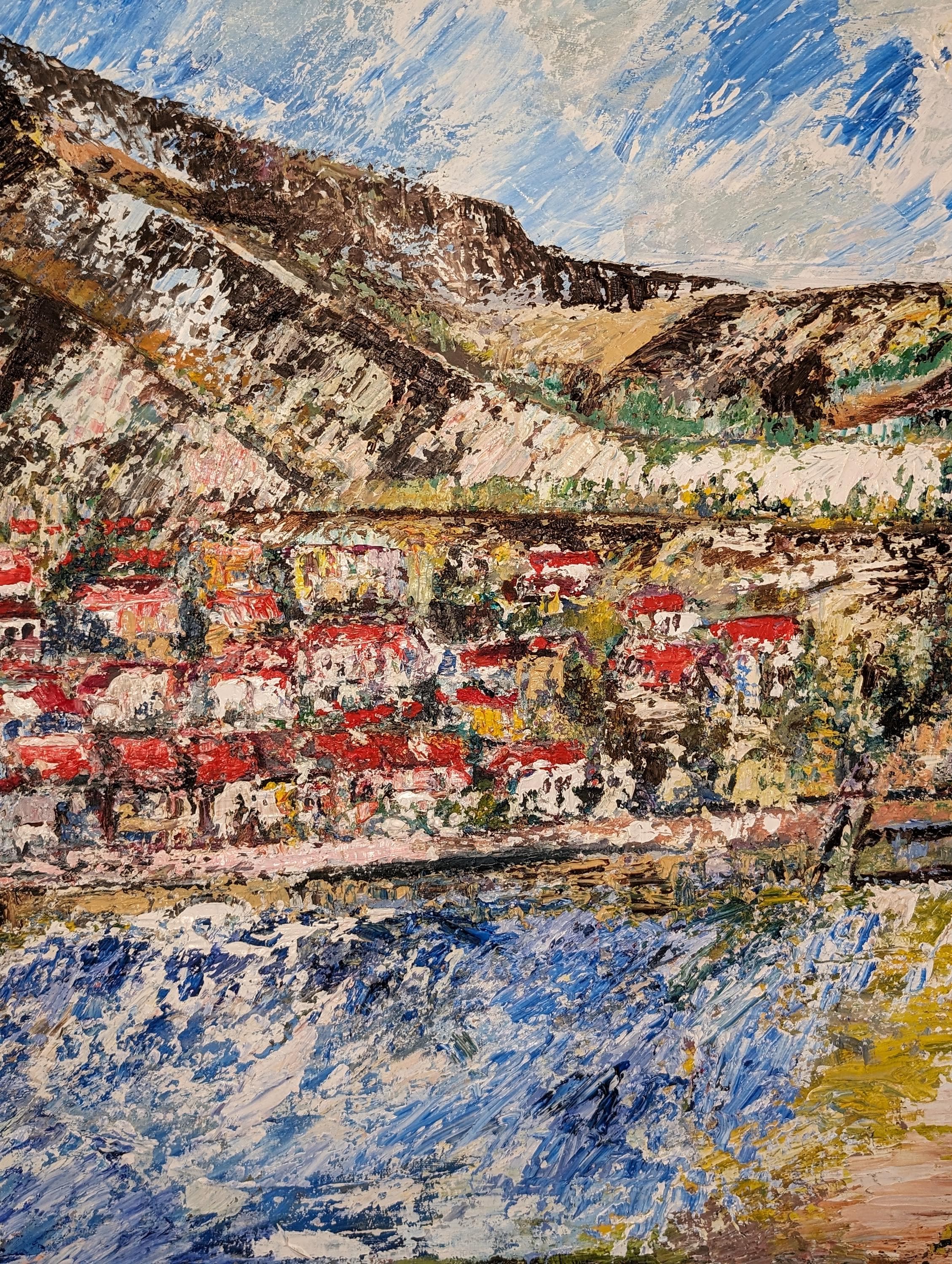 This is a painting of properties and trees by the waters edge in a typical Spanish vista of Mountains trees water sand with a visible sea wall