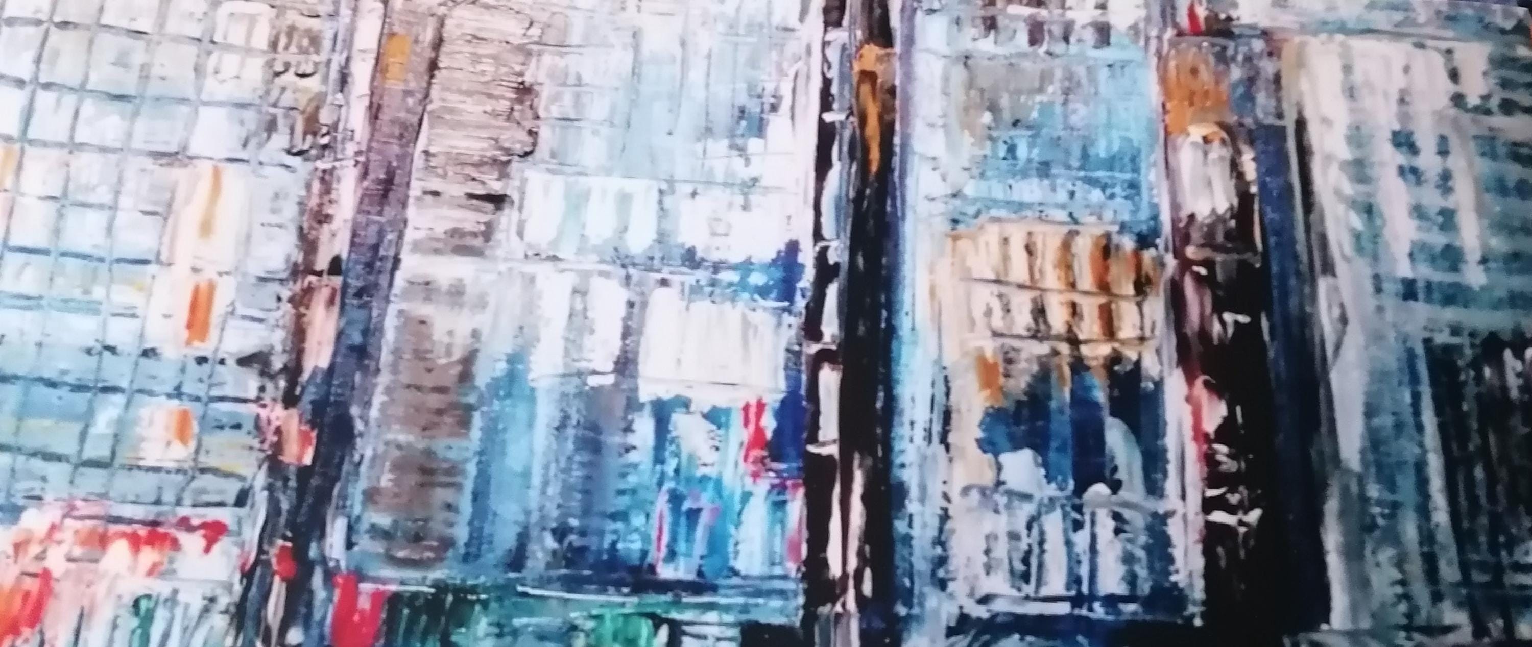 City cages working offices retail buildings showing light from inside reflecting light outside at night