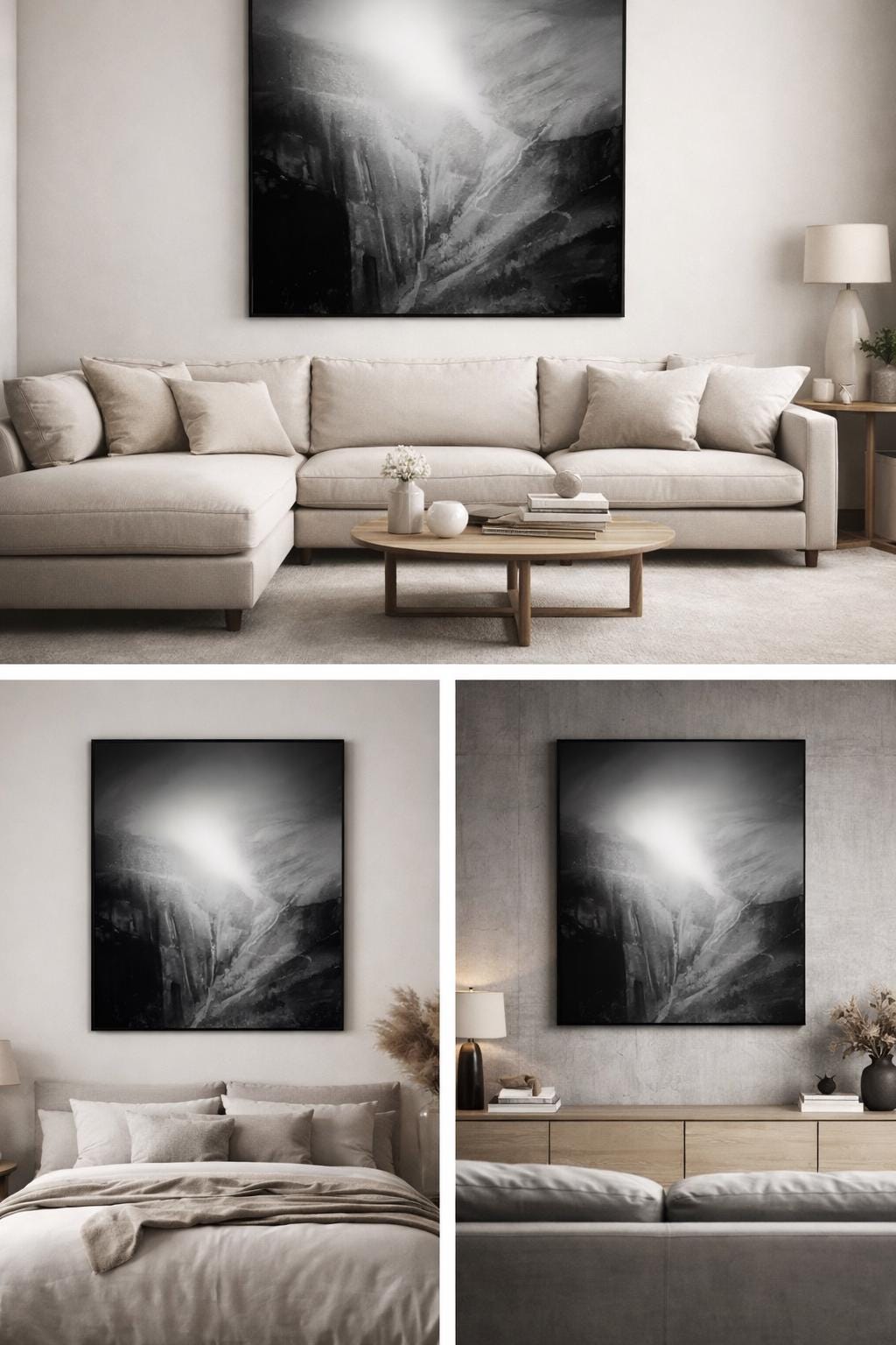 Painting of a mountain pass with light breaking through illuminating the scene black and white stark contrast in the right room environment